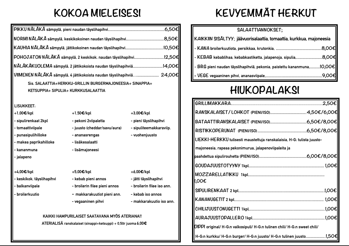 Tervetuloa Oulaisten Herkku-Grillille! Menu Ennakkotilaukset Voit halutessasi tilata ruoat soittamalla ennakkoon numerosta +358 40 657 8859 ja noutaa ne luukulta. Emme vastaanota puhelintilauksia enää 30min ennen sulkemisaikaa. AVOINNA Maanantai SULJETTU Tiistai klo 17-23 Keskiviikko klo 17-23 Torstai klo 17-23 Perjantai klo 17-2 Lauantai klo 17-2 Sunnuntai klo 15-21 Sijainti